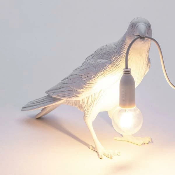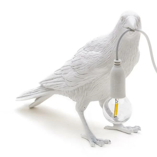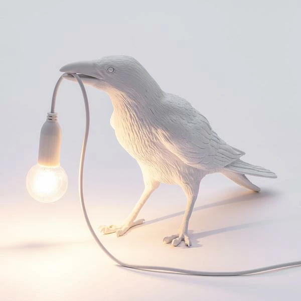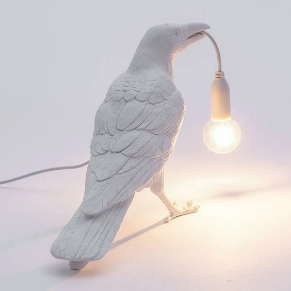 As part of the three Clever Raven collection, designed by Marcantonio for the world-renowned Italian brand Seletti, is this ‘waiting raven’ table lamp. The offbeat and unusual design transports your room into a world of nonconformity where humour and creativity with quality craftsmanship are embedded into every refined detail in this unique lamp. The LED bulb is held up in the bird’s beak. Seek guidance from your waiting feathered friend to shed some light of wisdom. Description Length 38 cm, Height 17.5 cm, Width 23 cm. Bird Length is 29.5 cm, Height 18.5 cm, Width 12 cm. The cable length is 2.5m. The material is white casted resin. E14 bulb with 120-lumen warm LED light. The packaging is made of Seletti branded box with silk covered support and a certificate of authenticity. Designed in Italy. Special Care Instructions – For indoor use only.
