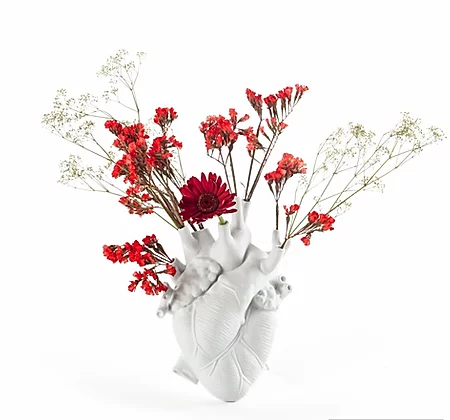 Amore in fiore is a heart-shaped vase that seems to come out of an essay on human anatomy. A modern love translated into a romantic but unpredictable gift. It is not a dream, it is love in bloom. It is not spring, it is love in bloom.