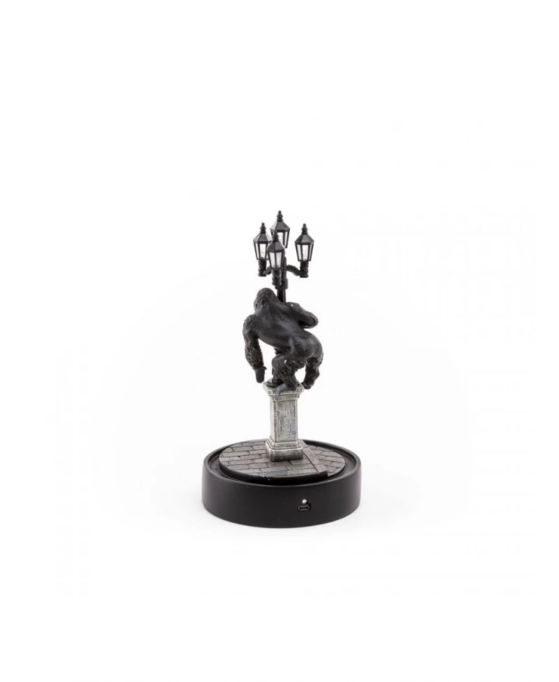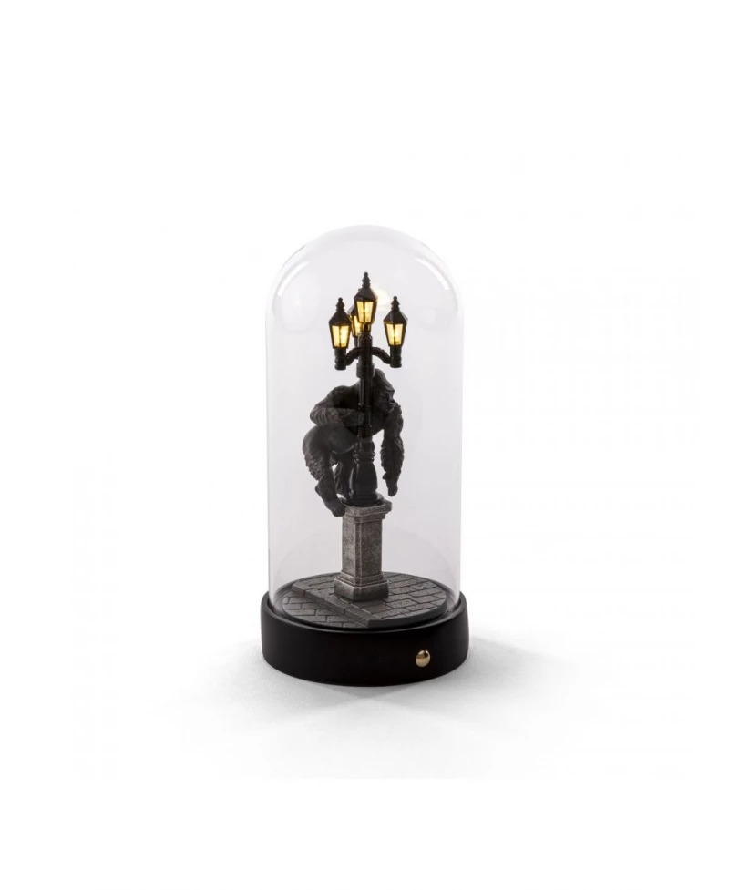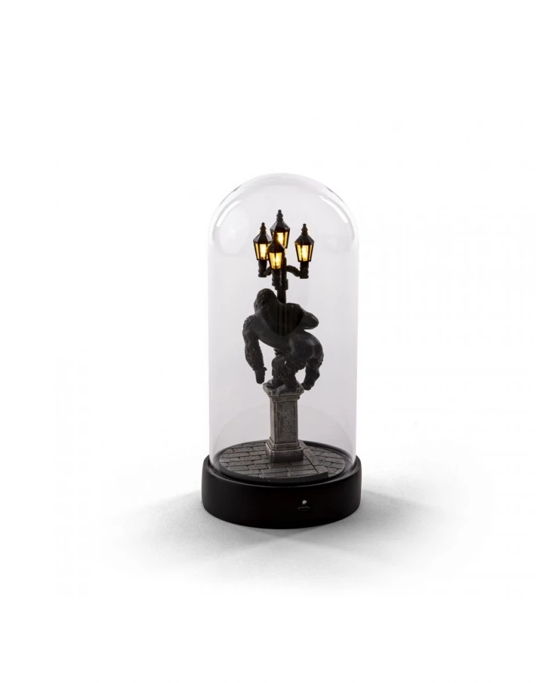 The protagonist of the jungle has arrived in the city and watches over the neighborhood from its street lamp. Another scenario under glass that shines a light on a scene that seems coming out from a noir movie, with a touch of 80’s sci-fi.