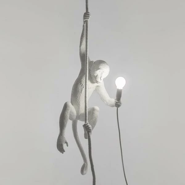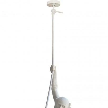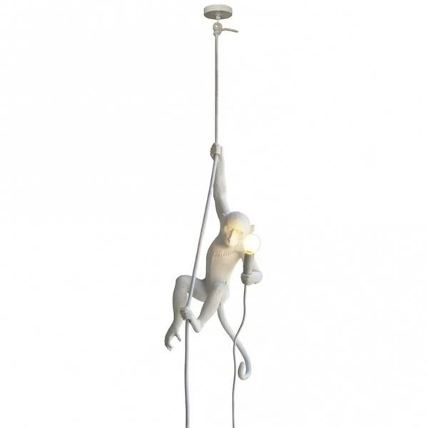 Part of a large Primates Collection designed by Marcantonio for the world-renowned Italian brand Seletti, this ceiling monkey lamp will attract quite the attention with its striking visual impact. The monkey is swinging from the rope, holding on with one hand and foot for dear life. Be prepared to be stared down by one charming chimp as the light glows mystifyingly in your face. Or better create a theatrical impact with several monkeys from the collection for a stunning scenographic display that captures the eyes and heart. Description Length 35.5 cm, Height 82 cm, Width 31.5 cm. The monkey length is 30 cm, Height 80 cm, Width 27 cm. The cable is 4.5m and the rope is 3m. The material is cast resin in a matte white finish and durable rope in white. E14 LED bulb. Ceiling canopy provided with rope and bulb. Comes with Seletti branded packaging and a certificate of authenticity. Designed in Italy. Special Care Instructions – Indoor use only.