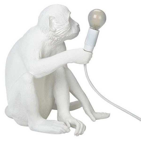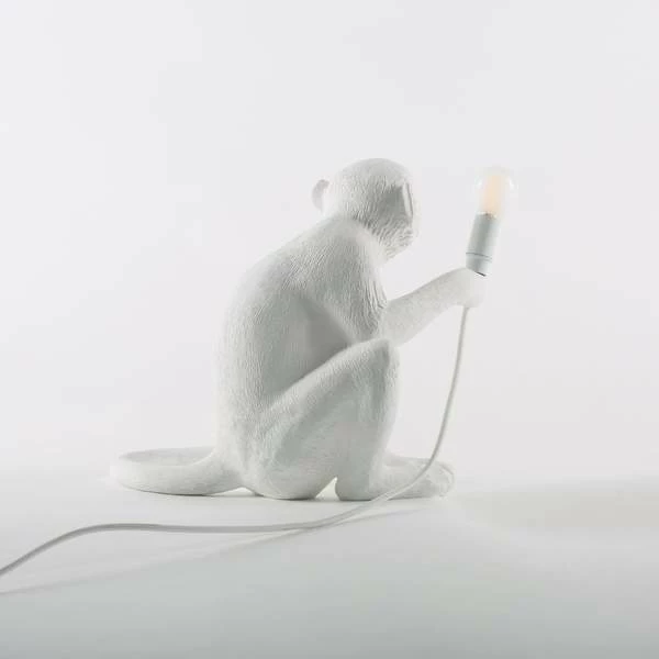 Part of a large Primates Collection designed by Marcantonio for the world-renowned Italian brand Seletti, this sitting monkey is not only a lamp but a work of art aimed to explore the natural relationship between human and primate. This whimsical monkey stares knowingly while holding up a bulb with one hand like a guide to the answers you seek. Create a theatrical impact with several monkeys from the collection to create a striking scenographic display that inspires creativity. Description Length 39 cm, Height 36.5 cm, Width 33 cm. The monkey length is 34 cm, Height 32, Width 30 cm. The cable is 4.5m. The material is cast resin in matte white finish. E14 LED bulb. Comes with Seletti branded packaging and a certificate of authenticity. Designed in Italy. Special Care Instructions – Indoor use only.