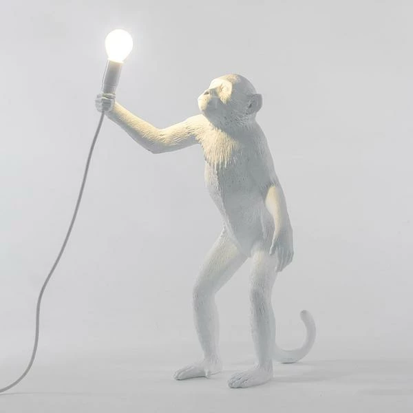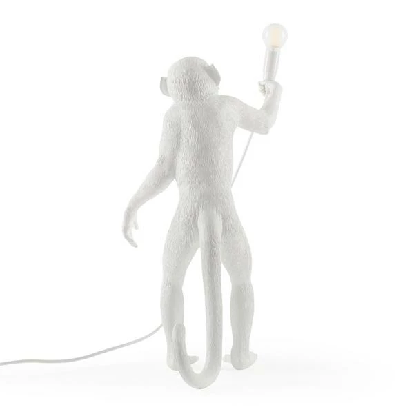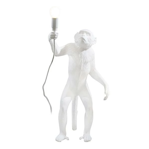 Part of a large Primates Collection designed by Marcantonio for the world-renowned Italian brand Seletti, this tasteful art piece showcases a wise standing monkey pointing the light into the far distance as he stares in wonderment upwards. The craftsmanship is superb, with detailing refined to enhance the realism of this centrepiece. Create a theatrical impact with several monkeys from the collection to create a striking scenographic display that stimulates the imagination. Description Length 51 cm, Height 58 cm, Width 29 cm. The monkey Length is 46 cm, Height 54 cm, Width 27.5 cm. The cable length is 4.5m. The material is cast resin in matte white finish. E14 LED bulb. Comes with Seletti branded packaging and a certificate of authenticity. Designed in Italy. Special Care Instructions – Indoor use only.