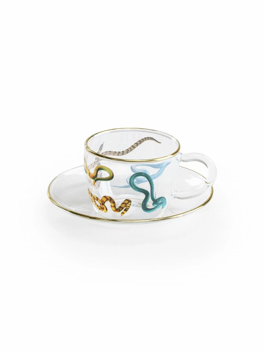 Glass cups and saucers with various prints. The images were created by Toiletpaper Magazine for Seletti. Suitable for a small cup of coffee.