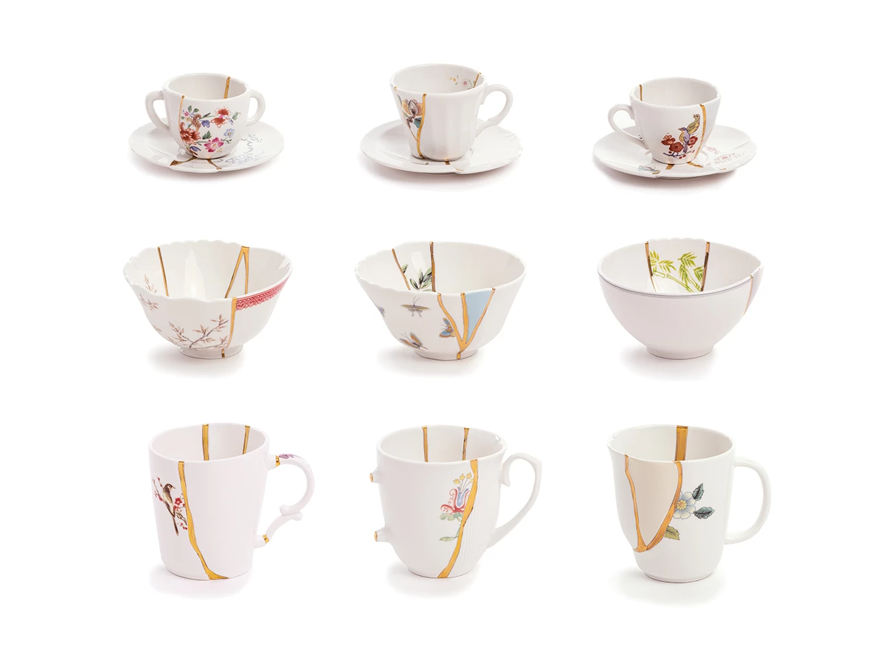 Kintsugi Japanese art takes contemporary forms. The delicate porcelain is glorified and enriched with gold fragments for a collection of table clothes made of charming and unexpected compositions. Mug Design: Marcantonio Material: Porcelain. Transform your tableware with this kintsugi mug from seletti. Designed by marcantonio raimondi malerba, it takes inspiration from kintsugi, the Japanese art of repairing ceramics with gold and silver in respect to the objects history. Featuring porcelain fragments in different patterns, the veins holding the pieces together are made from precious 24ct gold for an added touch of luxury. Pair this mug with more pieces from the Kintsugi range to stylishly coordinate your table setting.