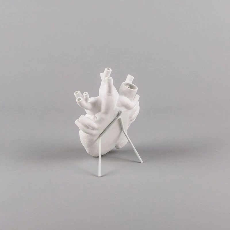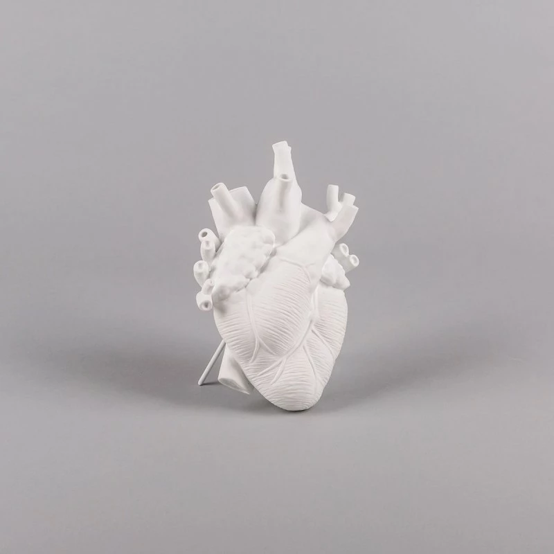 Marcantonio Raimondi Malerba has hit the spot again with love in bloom, has designed an original white porcelain vase with the shape of a human heart with its veins and arteries that serve as a container to put small flowers or buds.