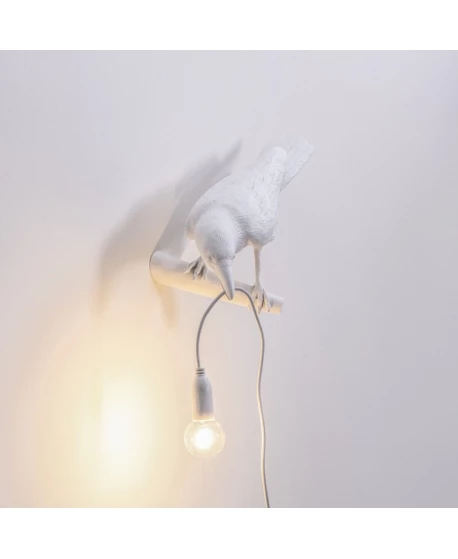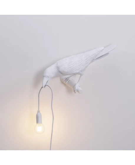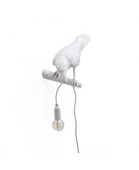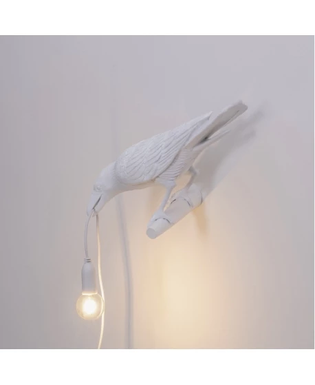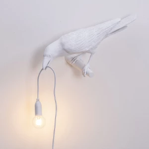 Lamp made of white resin by the Italian designer Marcantonio Raimondi. This lamp, as the name suggests, has the shape of a bird, which illuminates the path with a light bulb in its hand. In addition to decorative, it is a small work of art.